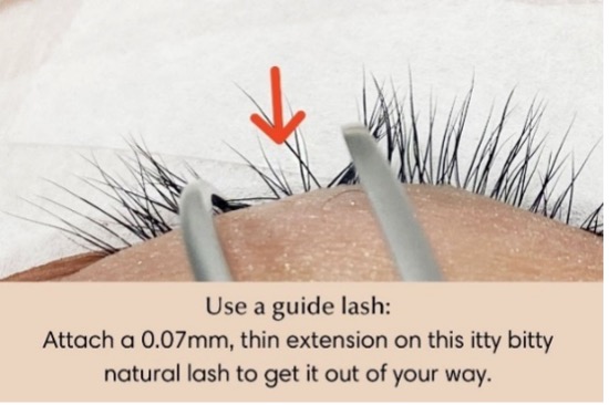 Attach a 0.07mm thick extension on the natural lash if you are having issues with little natural lashes
