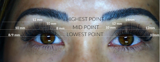 If the lash technician used the same styling and lash graduation on each eye, the left eye would look more open in comparison to the right eye. To correct this asymmetry, you would get the client to look straight at you and then mark where the lashes need to sit in order to correct the variance. From there, you can work out where the lengths will need to be different and where across the lash line you will need to change lengths. Correcting natural asymmetry is an advanced skill, but it is definitely a skill you should be aiming to master as many clients will have eyes that are different shapes and sizes. An example of the lash mapping used to achieve symmetry has been provided: